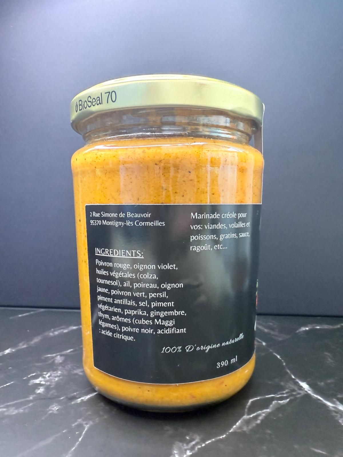● Poivron rouge ● Oignon violet ● Huile de colza ● Huile de tournesol ● Ail ● Poireau ● Poivron vert ● Oignon jaune ● Persil ● Piment antillais ● Sel ● Gingembre ● Paprika ● Piment végétarien ● Cube Maggi ● Thym ● Poivre noir ● Acide citrique (E330)